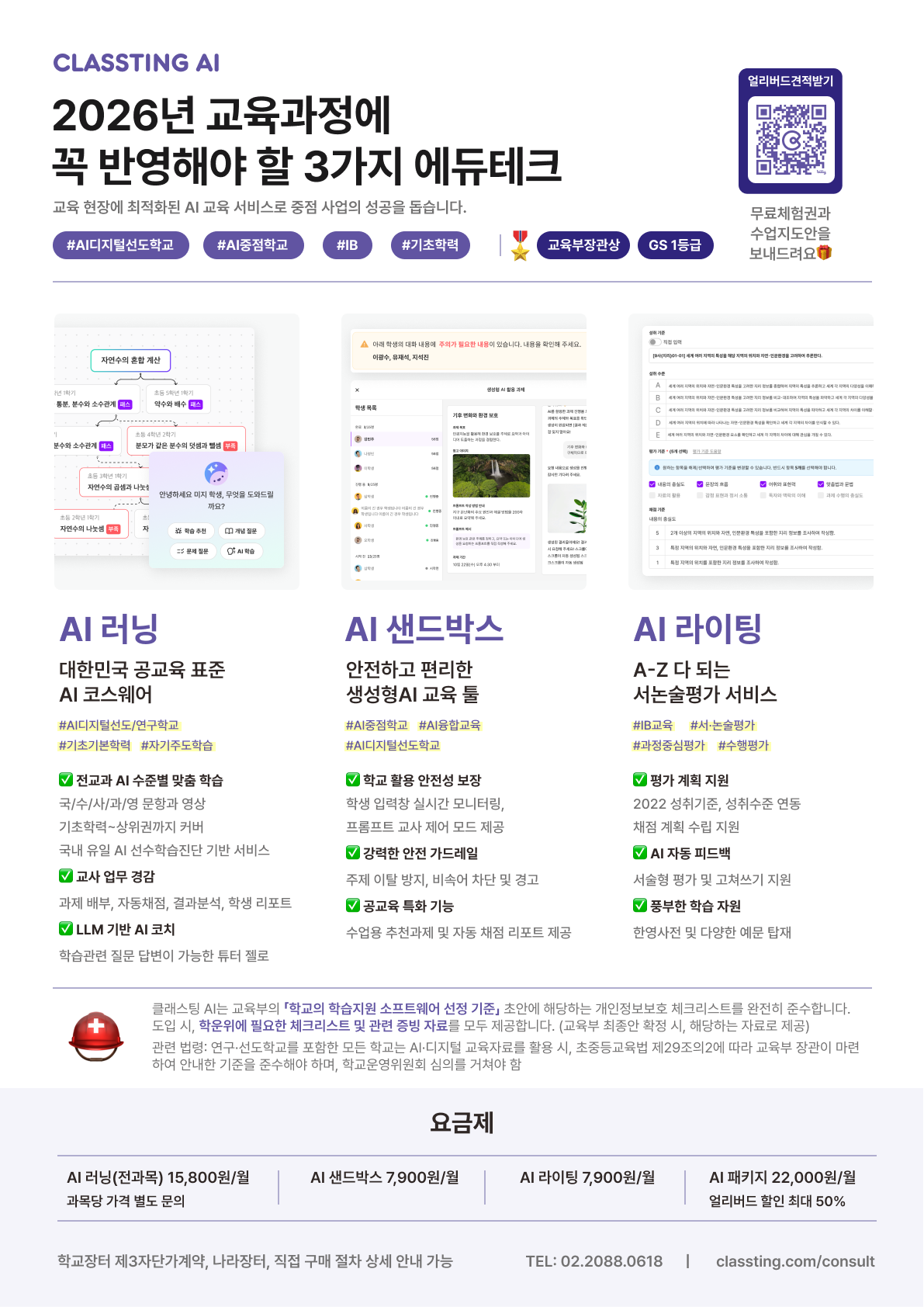 2026년에는 에듀테크 도입에서 개인정보보호법 준수 여부에 대한 검토와 학운위 심사가 필수가 될 예정이라, 그에 필요한 모든 서류를 보내드릴 수 있는 클래스팅AI와 함께 편안한 사업 운영 해보시길 바랍니다.