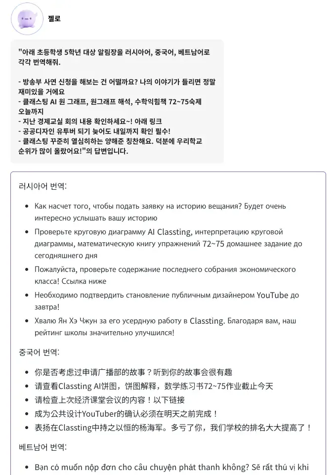 AI 기반 LMS에 있는 생성형 AI를 통해 학급 공지사항을 번역할 수 있다.