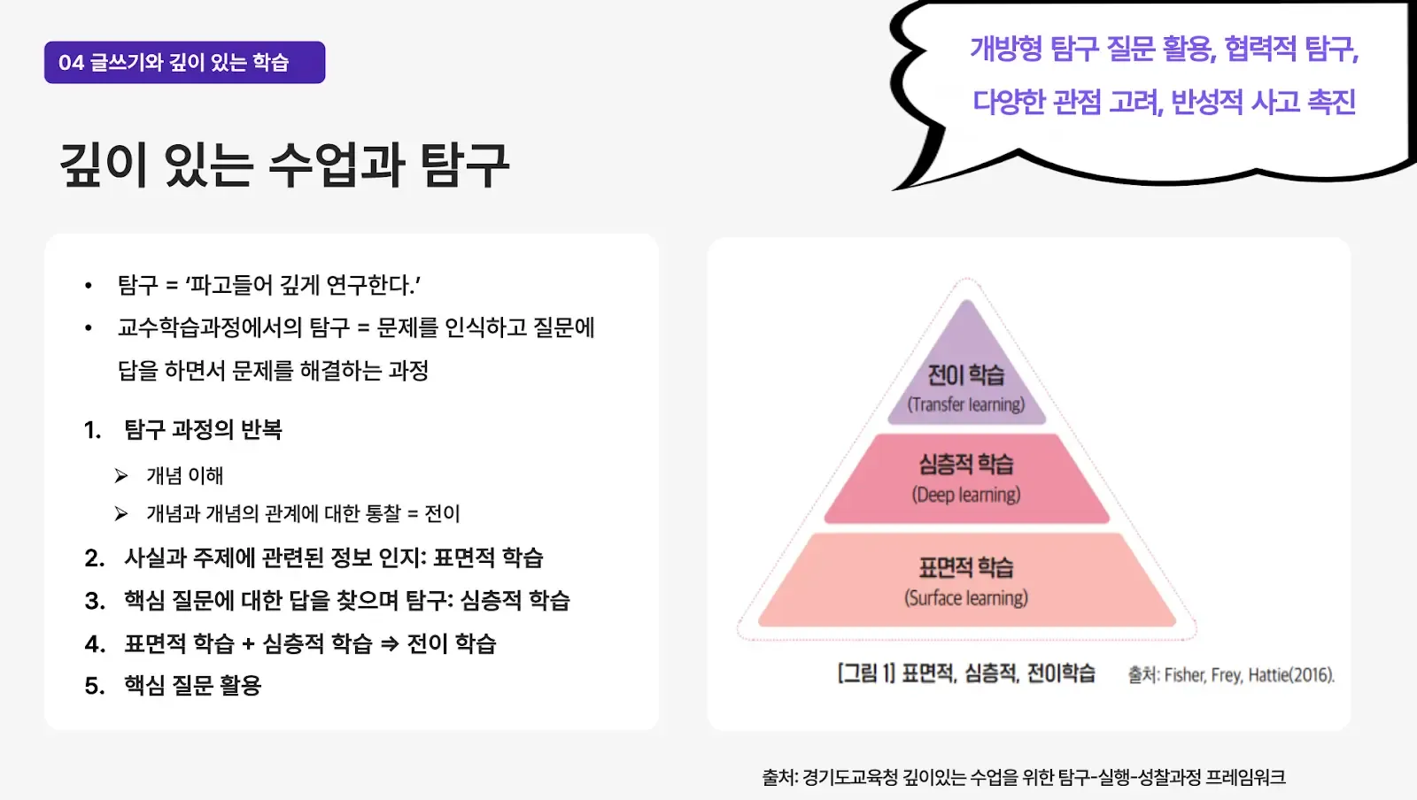 깊이 있는 학습에서 가장 강조되는 요소는 바로 ‘탐구’입니다. 교수학습 과정에서의 탐구는 단순히 정보를 찾는 것을 넘어, 문제를 인식하고 끊임없이 질문하며 답을 찾아가는 과정입니다. 이 탐구 과정을 통해 학생들은 표면적 학습에서 심층적 학습으로, 나아가 전이 학습으로 나아갈 수 있습니다.