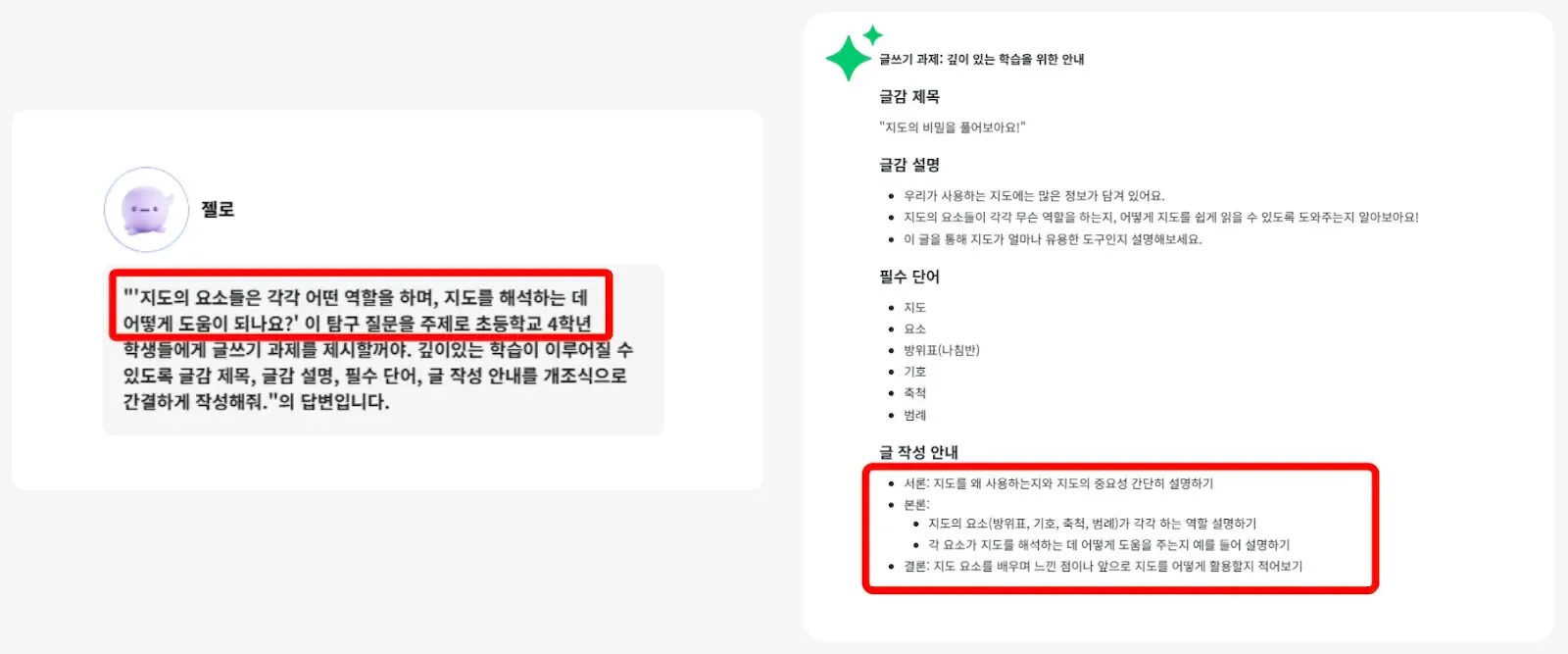 실제로 클래스팅에서는 ‘젤로(교육적 목적으로 조정된 GPT 기반의 AI 보조교사)’를 활용하여 이 과정을 효율적으로 진행할 수 있습니다.