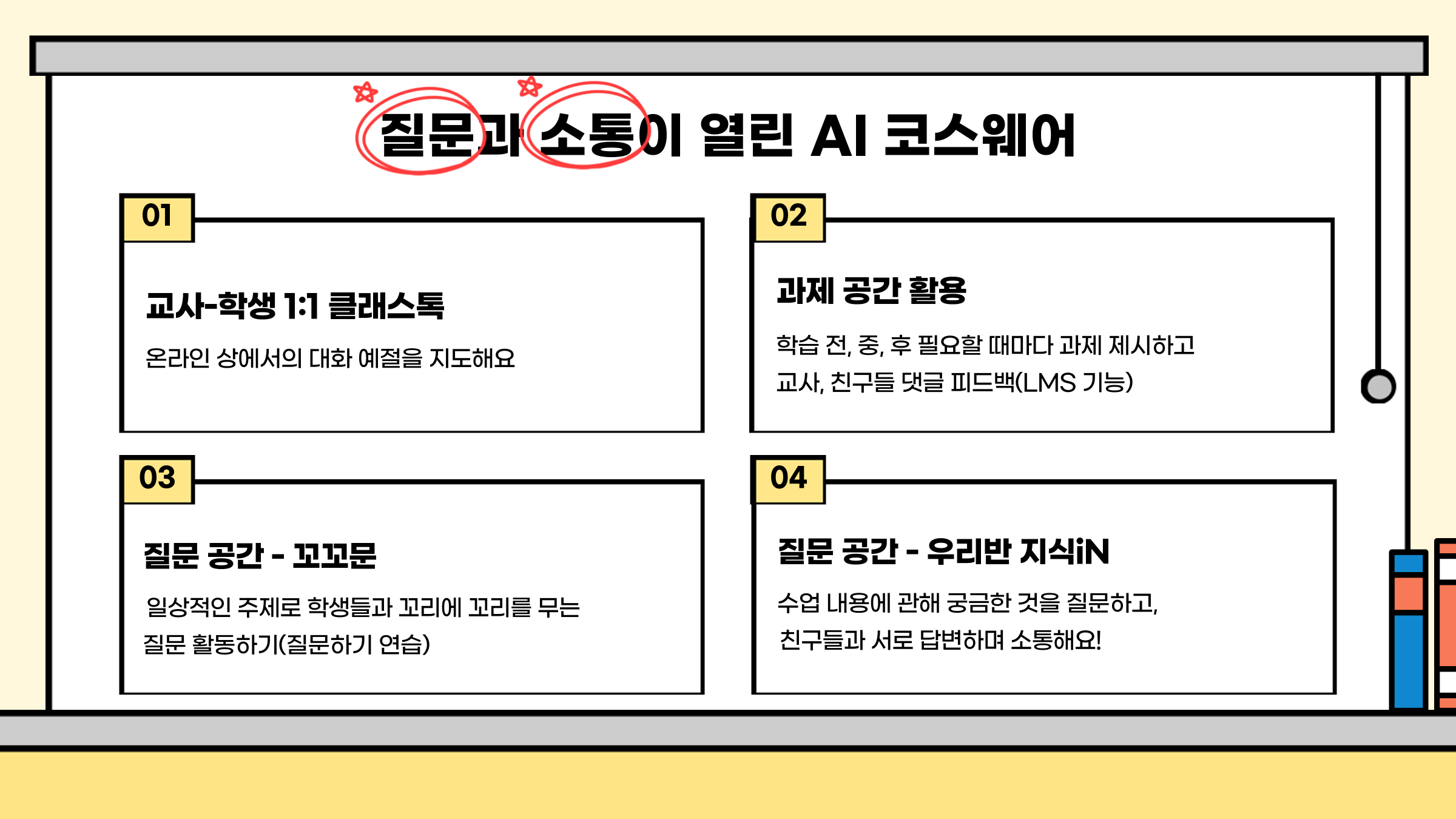 • 질문 공간: 학생들이 일상적인 주제에 대한 궁금증을 서로 질문하고 답하며 교우 관계를 강화하는 데 기여