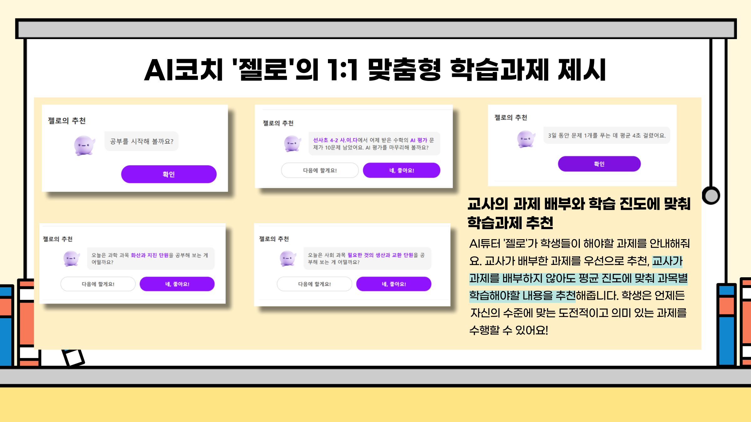 이 덕분에 학생들은 자신에게 적절한 난이도의 문제를 해결하며 학습을 이어갈 수 있었고, 선생님도 보다 효과적으로 개별 지도할 수 있게 됐습니다. 이제 더 이상 "다 풀었는데 이제 뭐 해요?"라는 질문을 들을 필요가 없어진 것입니다.
